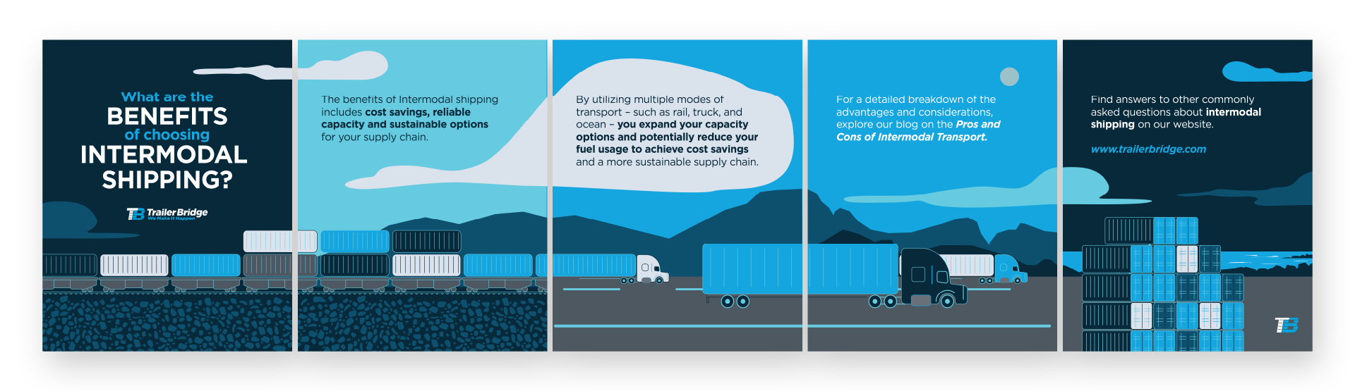 To break away from this pattern, I developed a more energetic and ownable visual system. The approach introduced custom shapes and textures derived from the company’s core services and assets, dynamic cutouts that enhanced interaction between elements, and custom illustrations that highlighted the human touch central to Trailer Bridge’s culture.